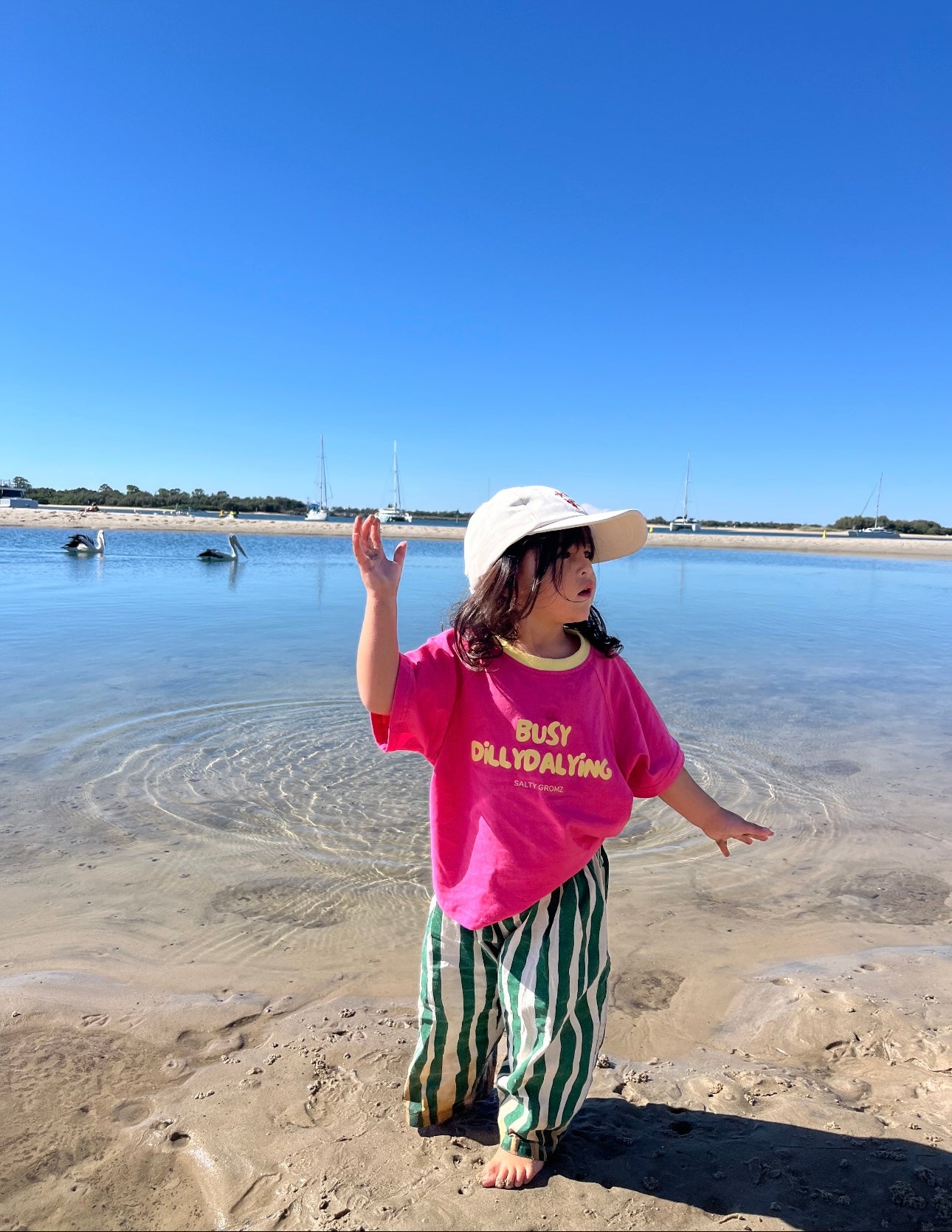 This 100% cotton pink and yellow oversized T-shirt is perfect for kids who love to dillydally. With a fun and playful design, this T-shirt guarantees both comfort and style. Let your child express their carefree spirit with our DILLYDALY T-shirt.